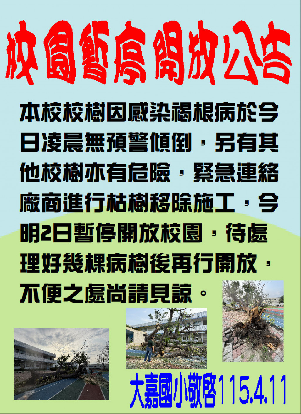 本校校樹因感染褐根病於今日凌晨無預警傾倒,另有其他校樹亦有危險,緊急連絡廠商進行枯樹移除施工,今明2日暫停開放校園,待處理好幾棵病樹後再行開放,不便之處尚請見諒.