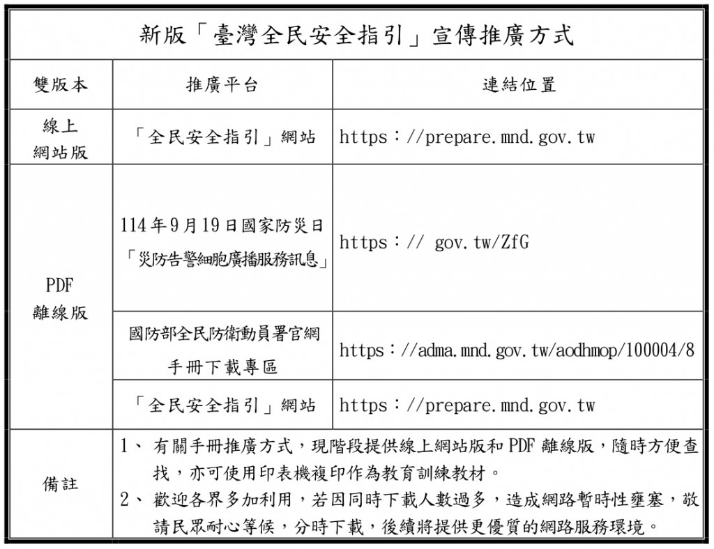 新版臺灣全民安全指引手冊《當危機來臨時:臺灣全民安全指引》,國防部已於114年9月16日公布,請加強宣傳推廣