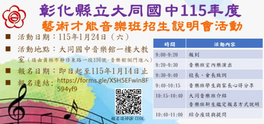| 一、 | 本校將於 115年1月24日(星期六)本校辦理 「大同國中115年藝術才能音樂班招生說明會活動」,懇請協助轉知貴校有 意報考的國小五、六年級學生及家長並鼓勵參加。本活動報名時間為即日起至 115年1月14日止 ,一律採google 表單進行線上報名,網址 : https://forms.gle/4xPPTLZ6Hmvh9Re5A。 |