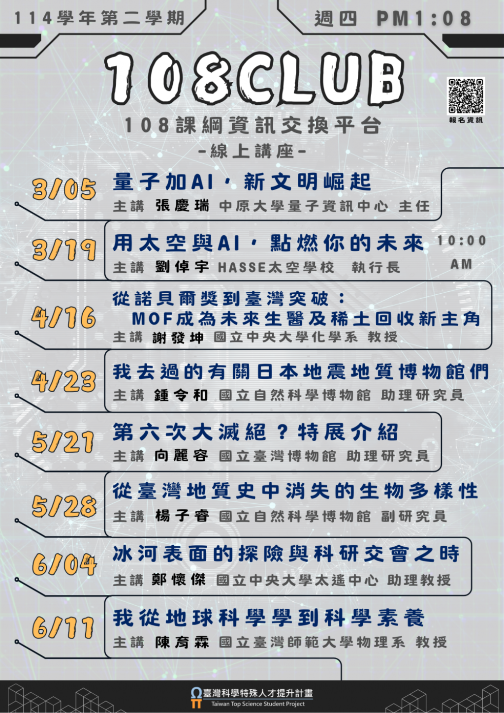 二、108俱樂部係一線上交流平台,邀請各界人士分享教學經驗與實務心得,藉以協助各級教師深化新課綱下「探究與實作」之多元實踐,各場次講題、講者及辦理時間詳如附件。
